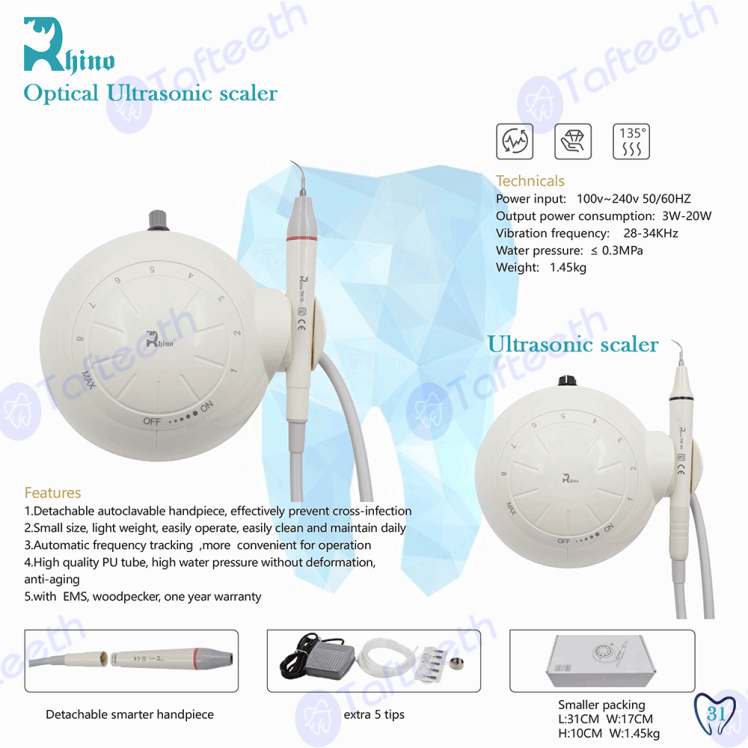 هندپیس جرمگیری وودپیکر نوری DTE HD-7L که در اسکیلر های dte d7 , d3 , d5 led و … به کار رفته و دارای هد نوری می باشد. هندپیس دارای یک ورودی آب برای انتقال به سمت هد می باشد و ۴ سیم که سه عدد از آن وظیفه ارتعاش سر قلم را دارند و یک عدد نیز وظیفه روشن کردن ال ای دی روی هندپیس را دارد . این هندپیس ها قابلیت اتوکلاو تا دمای ۱۳۴ درجه را دارند . از جمله مواردی که برای جلوگیری از خرابی هندپیس ها باید در نظر داشته باشید ، استفاده از سرقلم اصلی دستگاه می باشد