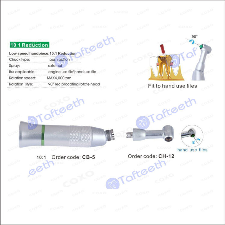 آنگل اندولیفت کوکسو COXO دارای فرزگیر پوش باتن و سیستم آب از خارج تولید شده که بسیار با کیفیت است و برای اندو کانال دندان مناسب و میتوان بر روی این آنگل، از فایلهای دستی باید استفاده نمود.